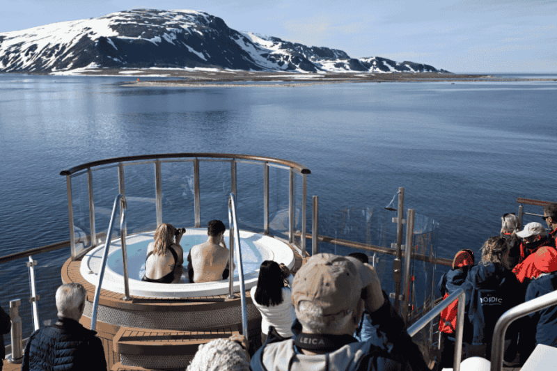 Zeker weten! Een van de spannendste momenten was tijdens een landing bij de walrussen. We stonden nog maar net aan land toen we via de porto van de expeditieleider hoorden: “Break break break — bear bear bear!” We moesten meteen evacueren. De rangers met geweren kwamen in actie — blijkbaar zat er een ijsbeer vlakbij in het water. Eenmaal terug aan boord bleek hij nog niet zichtbaar, dus we besloten onze zwemkleding aan te trekken om in het bubbelbad te gaan zitten. En ja hoor: 15 minuten later zagen we via de verrekijker de ijsbeer exact op de plek lopen waar wij net nog stonden. Vanuit het bubbelbad! Ongelofelijk…!