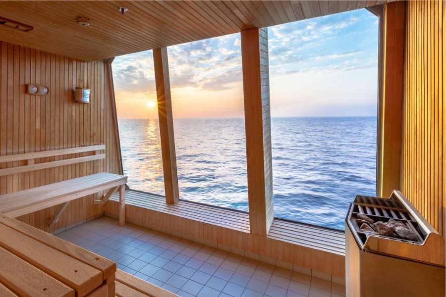 Op het grote buitendek kijk je heerlijk ver van je af. Ideaal om de omgeving tijdens het varen eens goed in je op te nemen. In de winter tuur je hier naar de hemel in de hoop het magische noorderlicht te spotten. Of werk je in de fitnessruimte in het zweet met een panoramisch uitzicht. Even relaxen? Loop dan direct door de sauna in. Ook met een prachtig uitzicht.