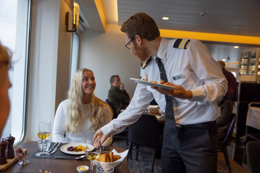 Aan boord vind je maar liefst vier restaurants. Ga naar het gevarieerde Torget voor een buffet of een vast dagelijks menu, bereid met lokale Noorse ingrediënten. Brygga is perfect als je trek hebt in een burger, pizza of salade met een ‘Nordic twist’. Culinair hoogstaand tafelen is ook mogelijk op de MS Richard With. De topkoks gaan à la carte voor je aan de slag in het stijlvolle restaurant Kysten. Een lekker broodje, gebakje of wafel? Die scoor je in bakkerij Multe. Voor een handgemaakte cocktail plof je neer in de Explorer Lounge & Bar.